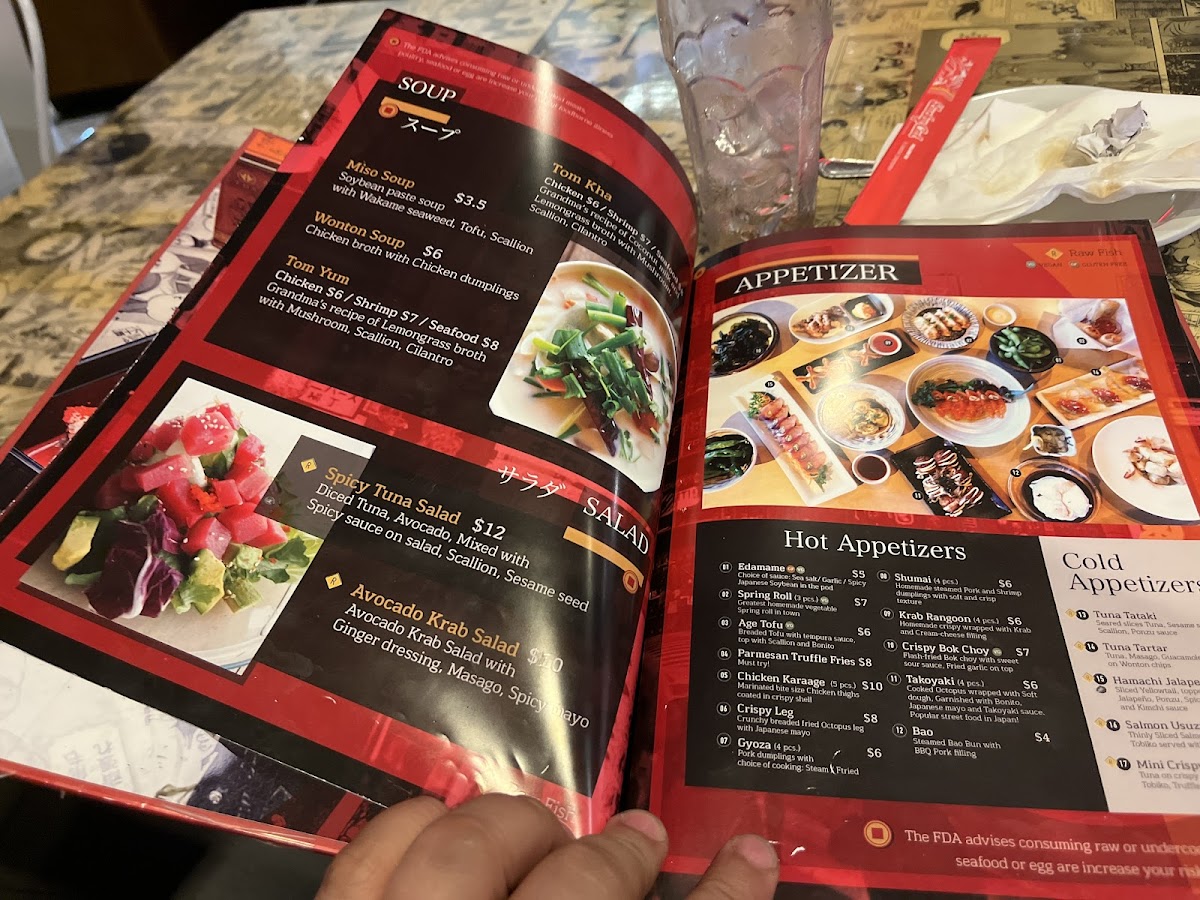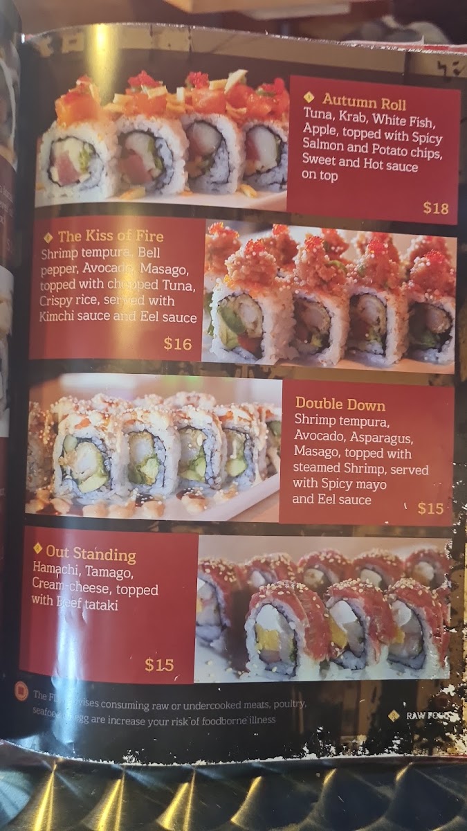 Raw Food. Shrimp tempura, Spicy Tuna, Crab, Asparagus, Scallion, Avocado, Tempura Flakes topped with BBQ Eel